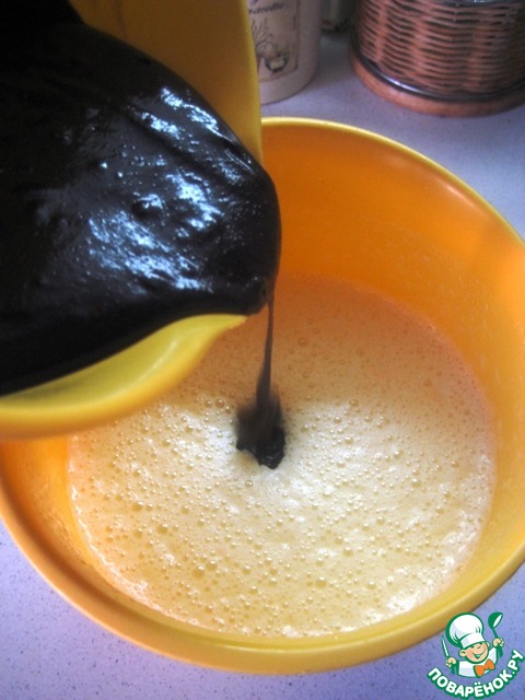 Влить шоколадно-мучную смесь в яичную, аккуратно и тщательно перемешивая лопаткой. Тесто получается жидким, стекает с лопатки.