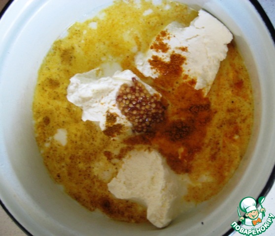 Для соуса соединить в кастрюльке молоко, сливочный сыр (использовала Альметте сливочный), соль, французскую горчицу и карри.