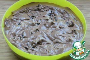 Выкладываем в форму для замораживания слоями -половину массы со сливками, сверху половину оставшегося бригадейро, затем оставшуюся сливочную массу, сверху последнее бригадейро, я сделала сверху разводы по бригадейро деревянной палочкой
