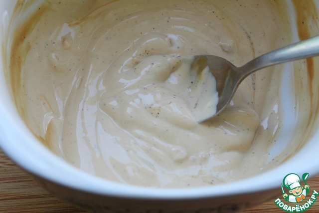 Соус - в сметану добавить соевый соус, перец, выдавить чеснок, перемешать и откорректировать на соль.