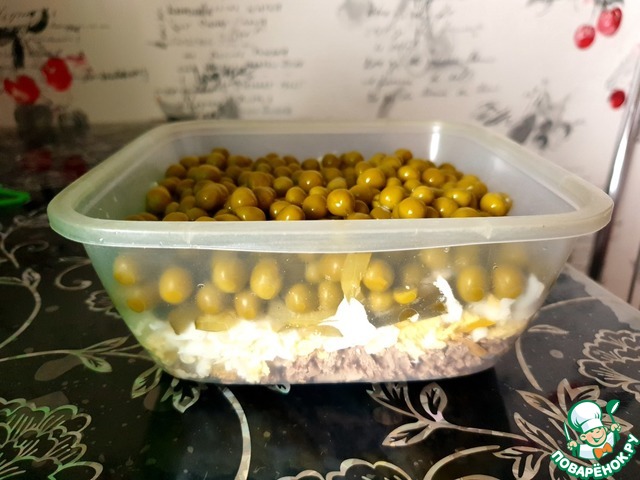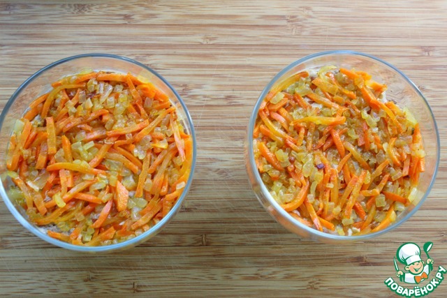 Следующий слой -морковь с луком. Выкладываем и разравниваем.