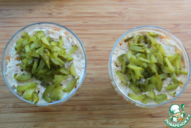 Следующий слой - нарезанные соломкой маринованные огурцы.