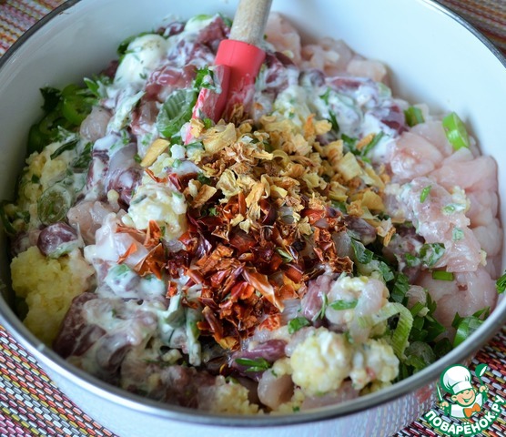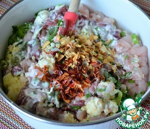 P.S.:Если у Вас нет сушёных, обжарить по 1/2 лука и перца, добавить без масла. Перемешать. -