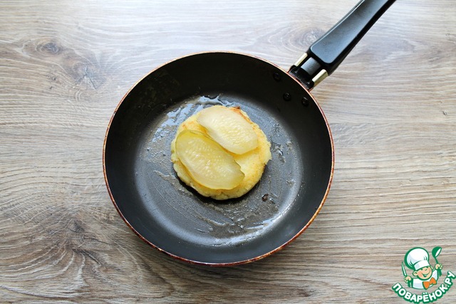 • В сковородке после яиц обжарим котлеты с двух сторон до румяной корочки. Положим сверху дольки соленого или маринованного огурца.