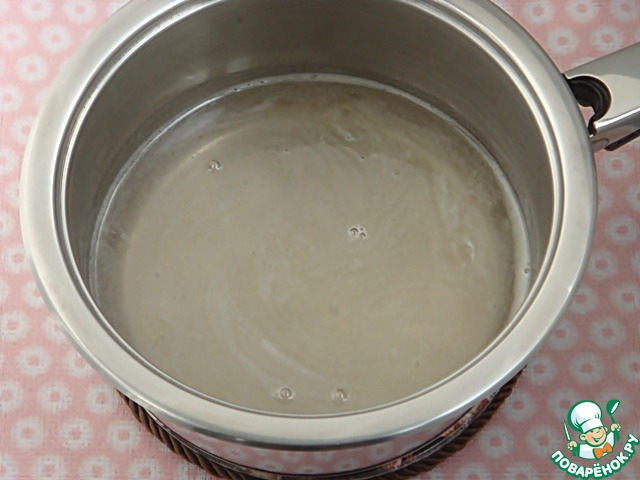 Поставить на средний огонь. Постоянно помешивая, довести до кипения и варить 1 минуту до растворения агара и превращения жидкости в прозрачный клейстер.