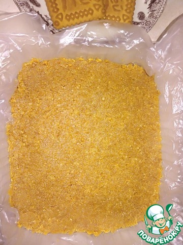 Сливочное масло распустить на малом огне. Печенье прокрутить в мясорубке. Соединить и утрамбовать в пластиковой форме размером 20 см на 20 см, застеленной пленкой (дно и бока).