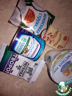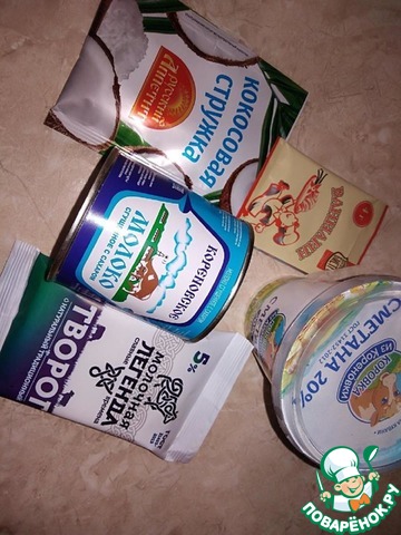 Подготовить продукты для первой части творожного крема: сметану, творог, сгущенное молоко, ванилин, кокосовую стружку