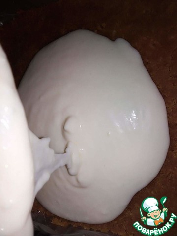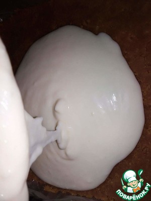 Вылить полученный творожный крем с желатином на слой из печенья. Консистенция: как жидкая сметана, легко льющаяся