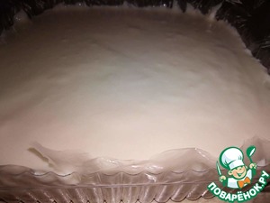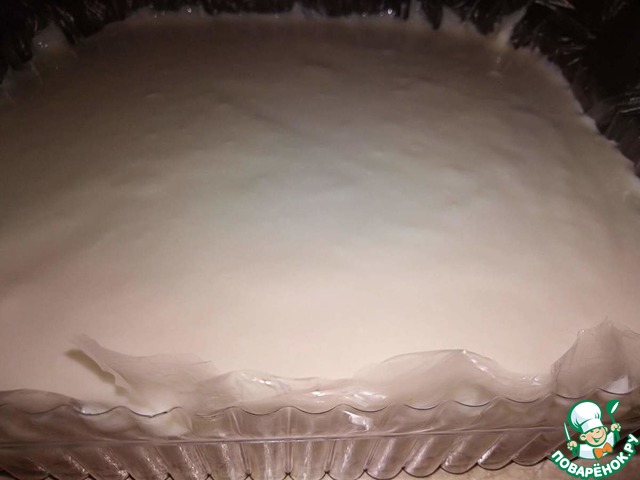 Через четыре часа пластик разрезать по бокам, аккуратно отогнуть пленку с боков. Поддеть под низ торт широкой лопаткой и, убрав снизу пленку, перенести на лопатке на широкое плоское блюдо.