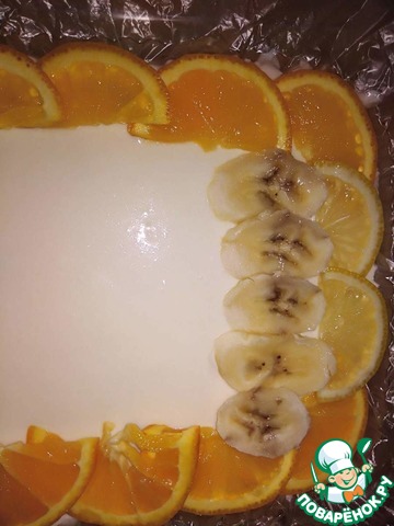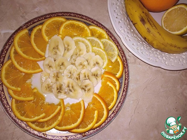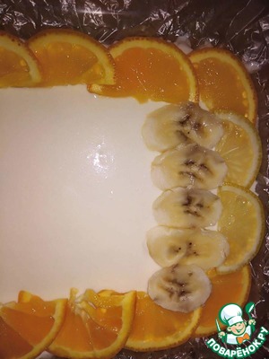 Ближе к истечению 40 минутного нахождения будущего торта в холодильнике, подготовить помытые и высушенные фрукты: нарезать 1 средний по размеру апельсин тонкими полукружиями, подготовить 4 полукружия лимона, 1 банан среднего размера порезать тонкими кольцами наискосок непосредственно перед выкладыванием, чтоб не потемнели