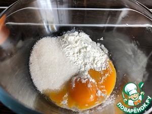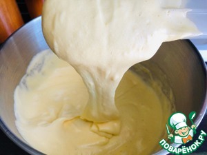 • - Просеянную муку смешиваем с разрыхлителем и частями добавляем к взбитым яйцам, аккуратно перемешиваем венчиком или силиконовой лопаткой массу сверху вниз. Тесто должно получиться воздушным. Стараемся, чтобы тесто не опало.