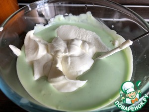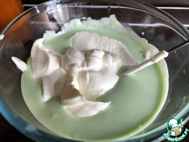 • - Разводи желатин в 30 мл. воды. Добавляем частями к остывшему лаймовому сиропу взбитые сливки, перемешиваем.