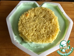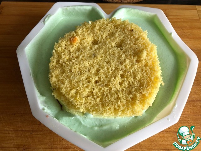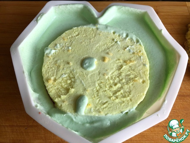 • - На желейную прослойку выкладываем бисквит. Сверху заливаем оставшимся крем - муссом и убираем в морозильную камеру примерно на 4-5 часов.