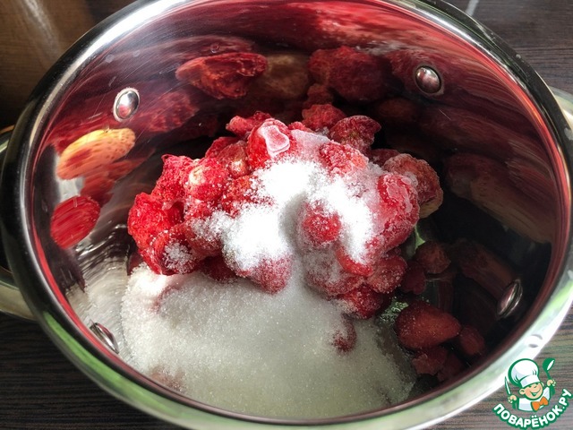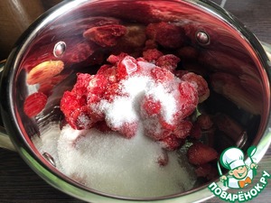 - Клубнику перекладываем в сотейник добавляем сахар и провариваем 2-3 мин с момента закипания.