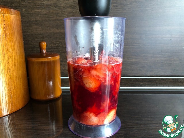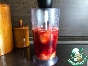 • - Перекладываем готовую клубнику в чашу блендера, измельчаем.