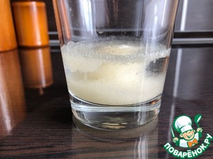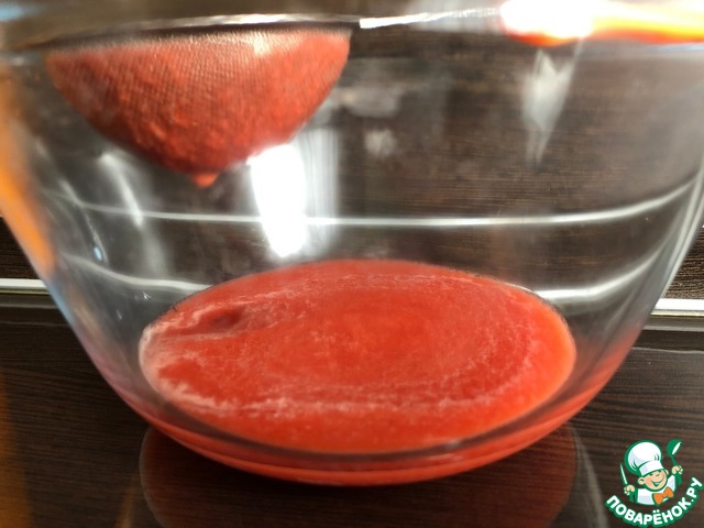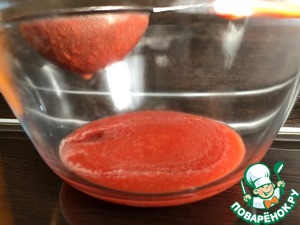 • - Разводим желатин и добавляем его к остывшему до 50 гр. клубничному пюре, перемешиваем.