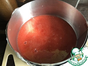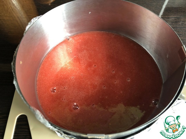 • - Форму резак застилаем пищевой плёнкой, ставим на разделочную доску и переливаем клубничную прослойку в форму. Убираем в морозильную камеру на 30-40 мин. до стабилизации.