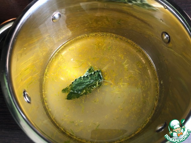 - В сотейнике смешиваем сок лайма, 40 мл. воды, сахар, цедру лайма, листики мелиссы, краситель. Ставим на огонь варим до растворения сахара.