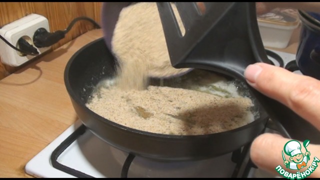 Тем временем на сковороду нальем 2 ст. л. подсолнечного масла и добавим 60 грамм сливочного. Когда масло растворится всыпаем панировочные сухари, хорошо их размешаем.