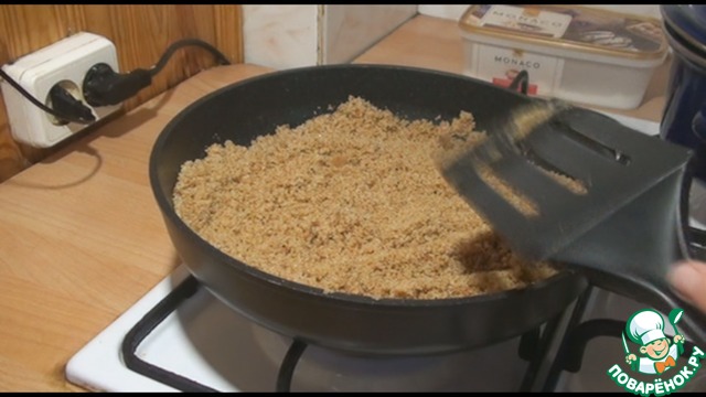 На среднем огне обжариваем, помешивая нашу посыпку минут 5. Важно, чтобы сухари не пригорели, а приобрели золотисто- коричневый оттенок. По истечении времени выключаем газ и отставляем посыпку остывать.