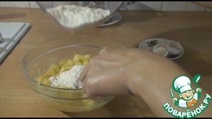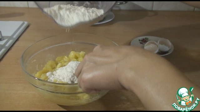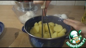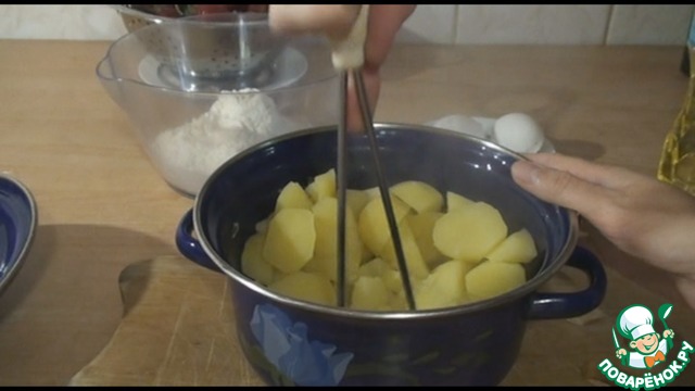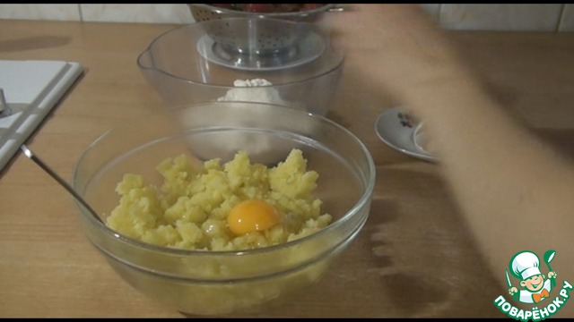 Отвареный картофель помять в пюре и оставить на 5 минут, чтобы немного остыл.