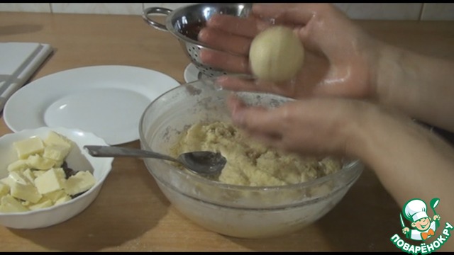 Приготовим мисочку с обычной водой, чтобы смачивать там руки. Берем одну столовую ложку теста на влажные руки, второй рукой распределяем в лепешку.