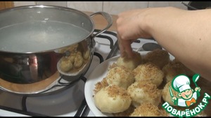 Кипящую воду посолим и опускаем кнедли. Из этого количества теста получается 19-20 кнедлей, я варила в два захода. Они прилипают к тарелке, с помощью мокрых рук берем их и опускаем в кастрюлю. Варим кнедли после того, как они всплывут три минуты.