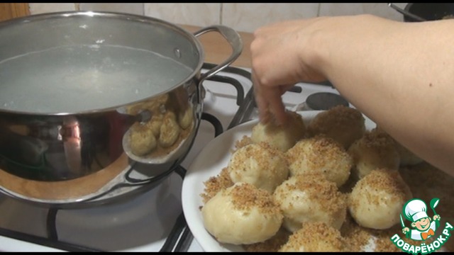 Блюдо или тарелку на которую будем выкладывать кнели посыпаем нашей посыпкой. Выкладываем готовые кнедли и сверху еще обильно посыпаем, можно обвалять в посыпке. Варим вторую партию и всё проделываем аналогично.