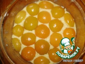 Тесто вылить в форму. Сверху выложить абрикосы и запечь при 200С минут 25.