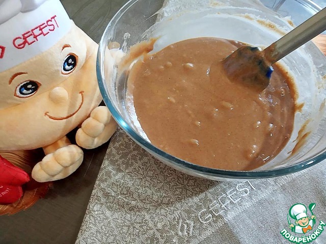 Добавляем яйца, молоко и растительное масло и тщательно перемешиваем. Затем добавляем кипяток и быстро перемешиваем до однородности.