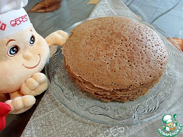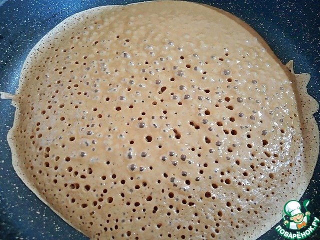 Хорошо разогреваем сковороду с антипригарным покрытием и убавляем огонь до среднего. Выливаем на сковороду 1,5-2 средний половника теста и равномерно распределяем (у меня сковорода диаметром 28 см, я наливала по 2 средний половника теста, всего получилось 5 коржей). Закрываем сковороду крышкой и выпекам, пока верх не начнёт чуть схватываться. Затем переворачиваем и выпекаем, пока не подрумянится низ.