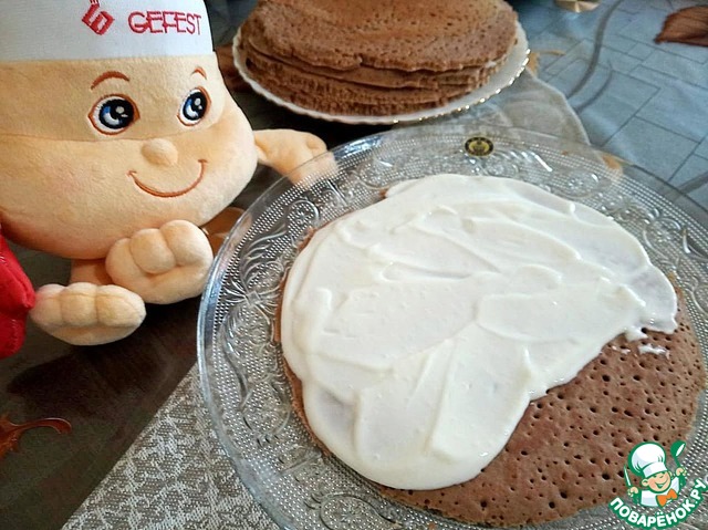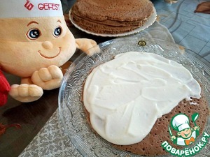 Кладём коржи дырочками вверх и обильно смазываем кремом.