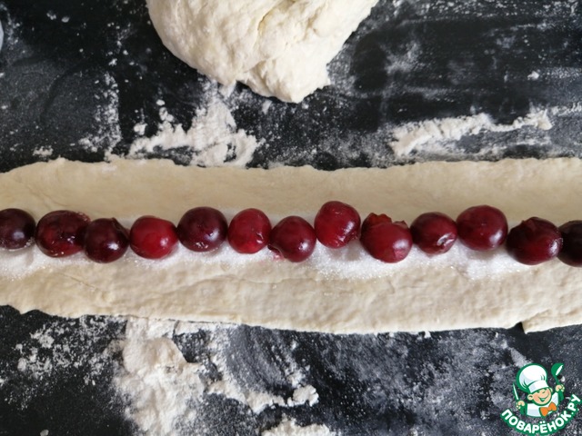 Замесить эластичное тесто, при необходимости добавить муку, раскатать тесто, разрезать на полоски длиною 30 см и шириною 8 см. В центр выложить сахар, сверху вишни, очищенные от косточек