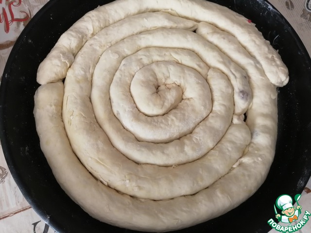 Защипнуть края, образовав рулетик. Смазать противень сливочным маслом, выложить рулетики в виде улитки