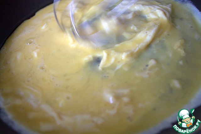 Продолжаем мешать венчиком омлет на сковороде, если позволяет покрытие. Или мешаем деревянной лопаткой.