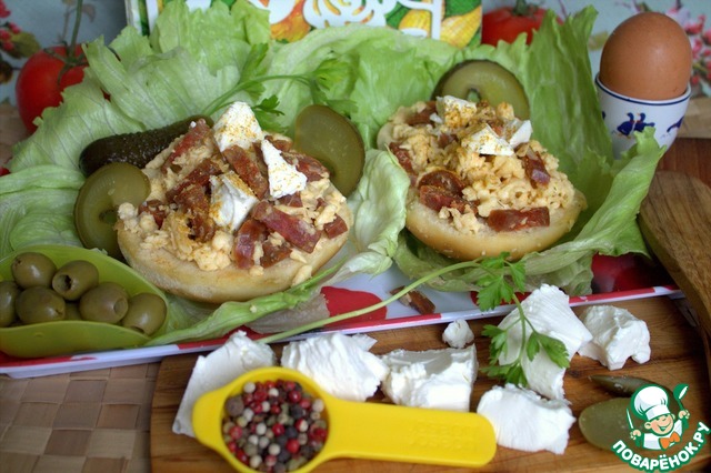 Перенести омлет на булочку, сверху покрошить брынзу или др. сыр.