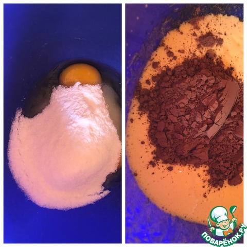 Яйца взбить с сахаром и ванилином в течение 2 минут на высокой скорости миксера. Добавить масло и какао, взбить минуту.