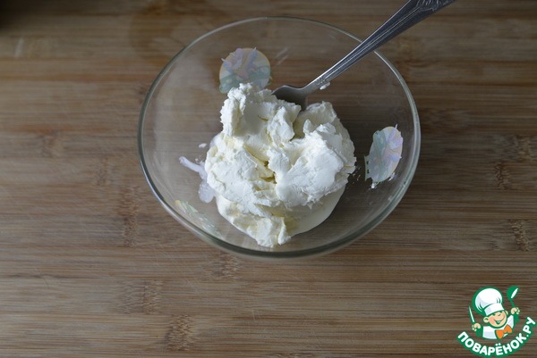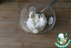 Творожный сыр тщательно перемешиваем в крем со сливками, можно взять йогурт или сметану для уменьшения калорийности блюда.