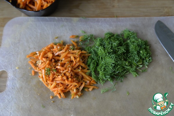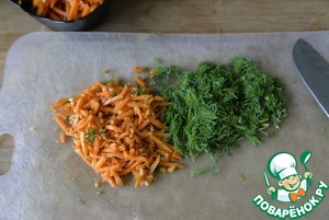 Берём морковь по-корейски, готовую или делаем сами, режем, чтобы не было длинной моркови и было легче перемешивать.