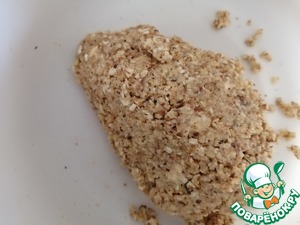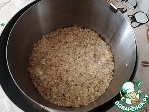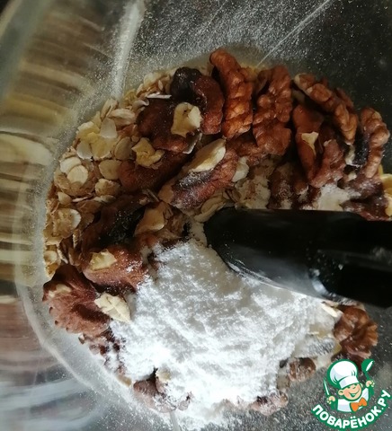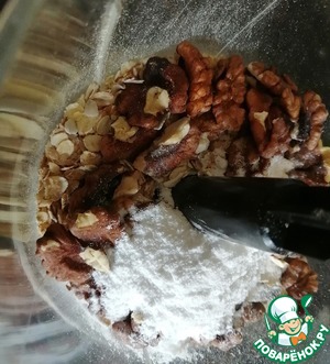 В блендере измельчить хлопья злаковые и грецкие орехи, добавить сахарную пудру