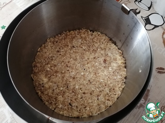 На блюдо установить пекарское кольцо и выложить основу из полученной массы. Отправить в холодильник на 1 час