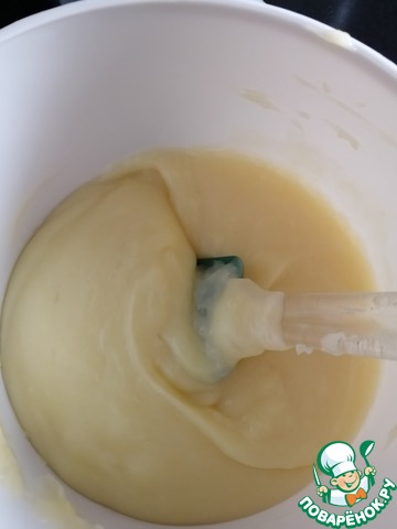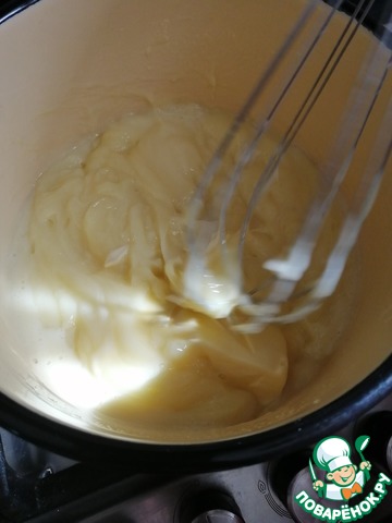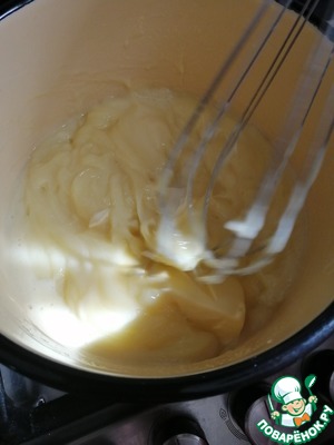 Ввести яично-крахмальную массу в горячее молоко и довести до загустения. Остудить крем. Добавить размягченное сливочное масло и взбить миксером