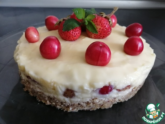Десерт соединил в себе корж-основу для торта Чизкейка (одна из вариаций) и крем для торта Фрезье. В начинке используется микс клубники и черешни. Торт очень нежный, а весенние ягоды придают десерту кислинку. Не требует выпечки, в процессе приготовления необходимо охлаждение.