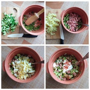 Окрошки делаю всегда в глиняном горшке и использую деревянную мялку. Окрошки люблю настоянные и поэтому сразу их заправляю и заливаю. Режем лук зелёный и укроп. Помещаем в горшок, насыпаем соли и мялкой бьём до выделения сока. Режем огурцы, отправляем в горшок. Картофель, яйца, колбасу (сосиски)-туда же. Если вы любите редис, положите и его. Всё перемешиваем, добавляем майонез, перчим по вкусу, опять перемешиваем.