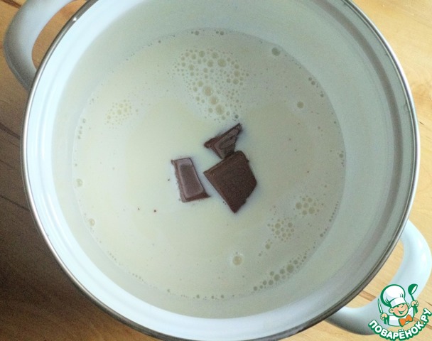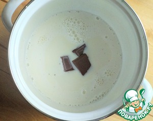 Для шоколадного слоя в кастрюльке смешать сливки (лучше использовать 33%, но можно и 20%), молоко, сахар и желатин. Нагреть максимум до 60 градусов, постоянно помешивая венчиком, до растворения желатина. Затем добавить шоколад.
