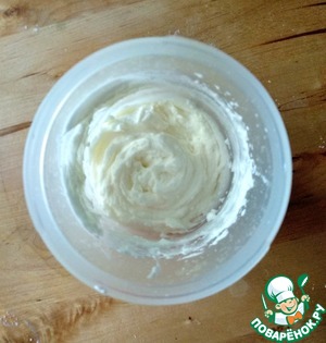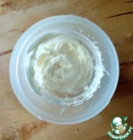 Для украшения сливки (33%) взбить миксером до устойчивых пиков, добавить сахарную пудру и ещё раз взбить.