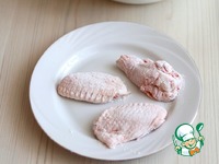У куриных крылышек отрезать верхнюю часть. Ее можно использовать при приготовлении бульонов. Разрезать крылышко на две части. |