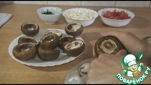 Берем грибы и освобождаем шляпку от ножки. Грибы берем самые крупные, они при запекании уменьшатся.
