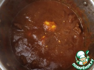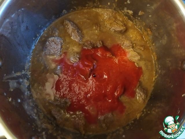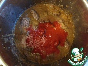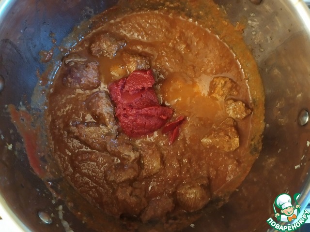 Добавляем мясо, бульон (ровно столько, чтоб покрыть мясо - ориентируемся на консистенцию гуляша, а не супа), томатный соус, много бербере, соль.