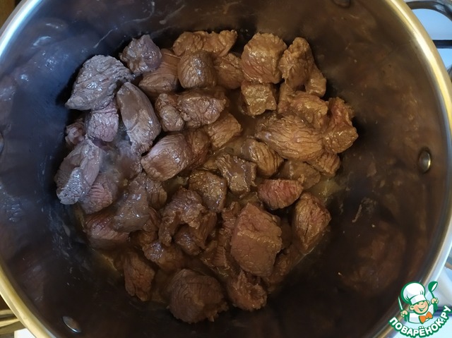 Режем говядину средними кусками. Наливаем в кастрюлю оливковое масло и обжариваем её. После чего откладываем в сторону.